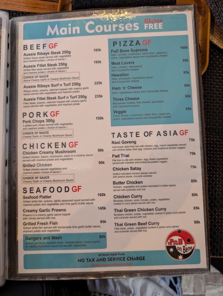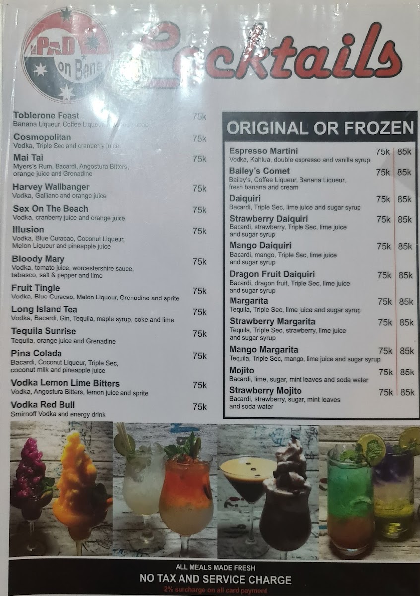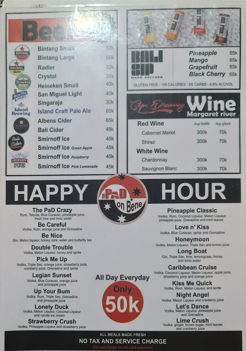 Overall, the menu feels inviting and straightforward, designed to pair naturally with The Pad On Bene’s friendly staff and warm ambiance, making it a place where both locals and visitors can comfortably enjoy their meal or unwind with a drink in hand.